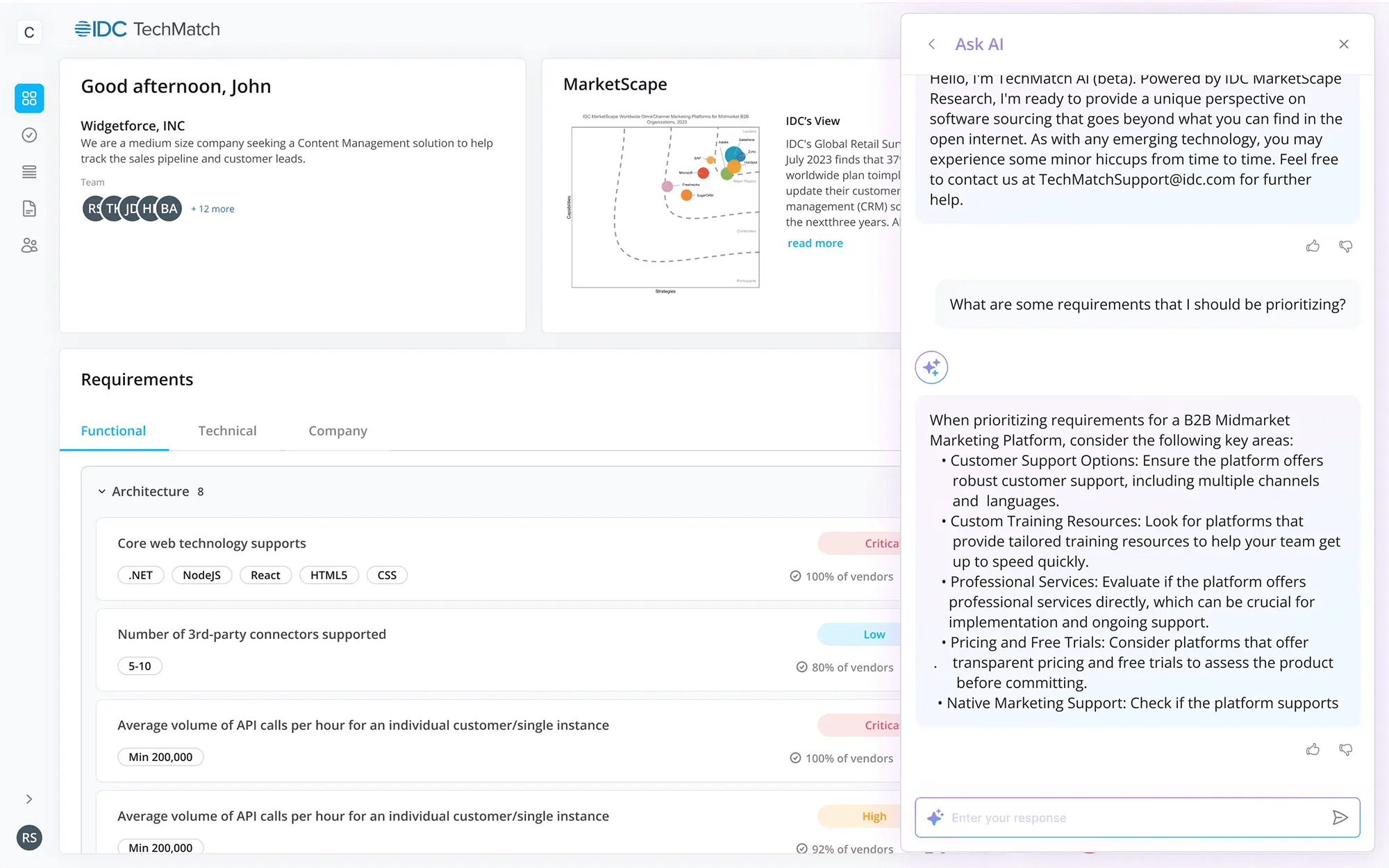 Solution: IDC TechMatch uses AI-powered QuickStart Requirements to capture all critical criteria upfront, enabling more complete, investment-ready RFPs.