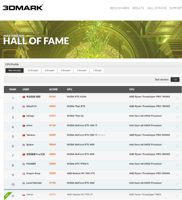 With standard settings and no overclocking, the AMD Ryzen Threadripper 7980X CPU score of 25,374 qualifies for 3DMARK’s MAX Threads Hall of Fame. It ranks among the top 100 benchmark scores ever recorded, and holds 25th place among the world’s most skilled overclockers.