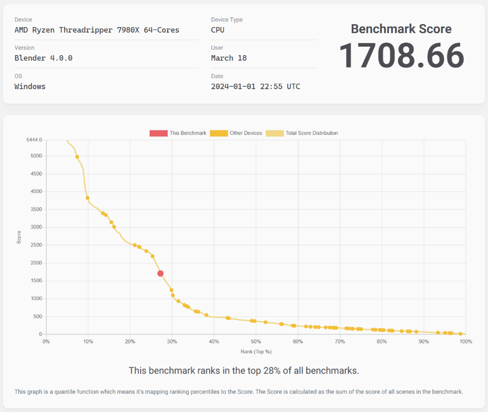 Blender Benchmark version 4.0.0 was used to assess the AMD Ryzen Threadripper 7980X processor’s rendering performance. With a score of 1708.66, the processor’s performance ranked among the top 28% of benchmarks running the same workloads. Given the inclusion of GPU results, the CPU performed brilliantly.