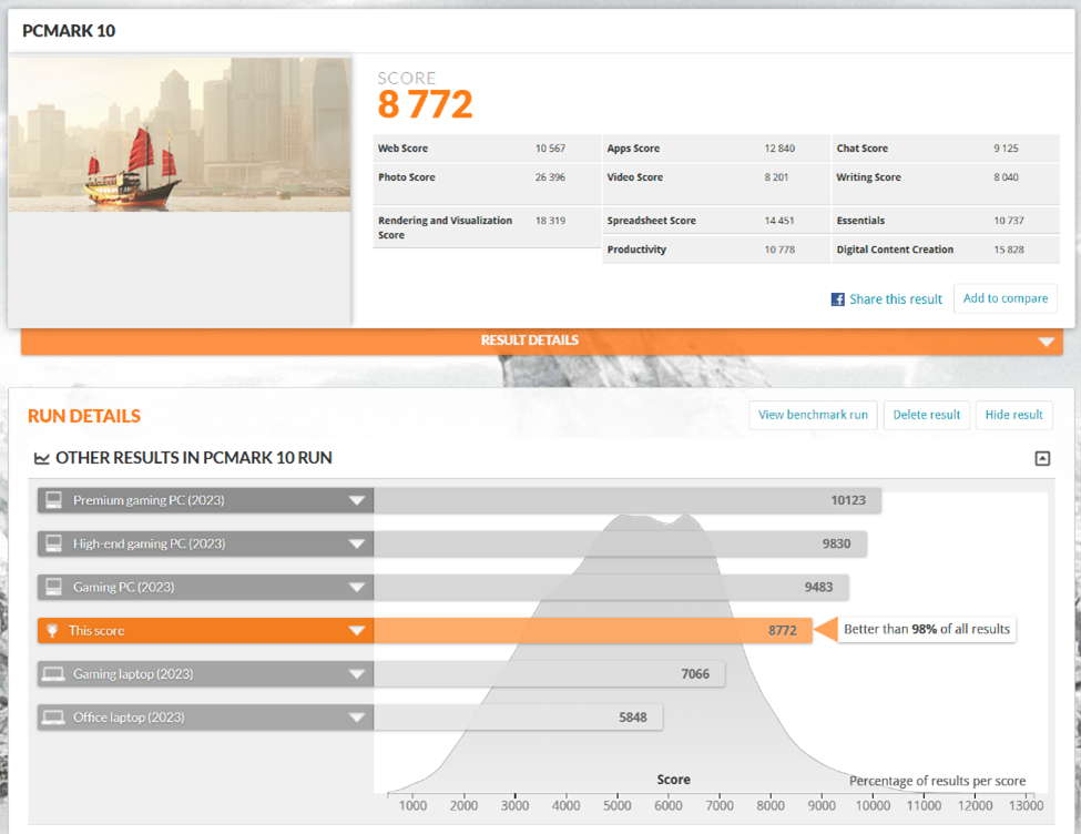 The 8,772 score the test platform achieved was better than 98% of all results produced by PCMark 10.