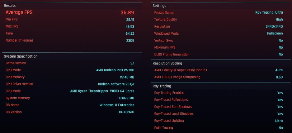 Cyberpunk 2077 ran at an average 36fps at 1440p, registering a minimum of 28fps. Ultra-ray tracing presets and FSR 2.1 features were automatically enabled.