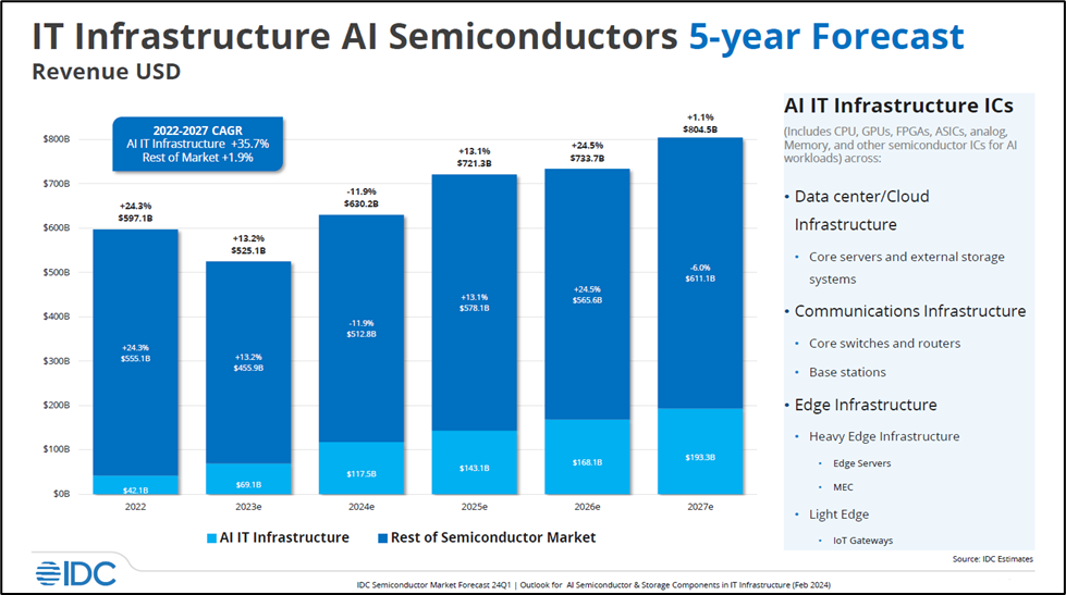 In 2022, IT Infrastructure for AI semiconductors was just $42.1 billion. By 2023, IDC estimates it had risen 64% to $69.1 billion and by 2024 we expect the market to accelerate by 70% to $117.5 billion. By the end of 2027, we forecast that IT Infrastructure for AI semiconductors will reach $193.3 billion representing a 5-year CAGR of 35.7%.