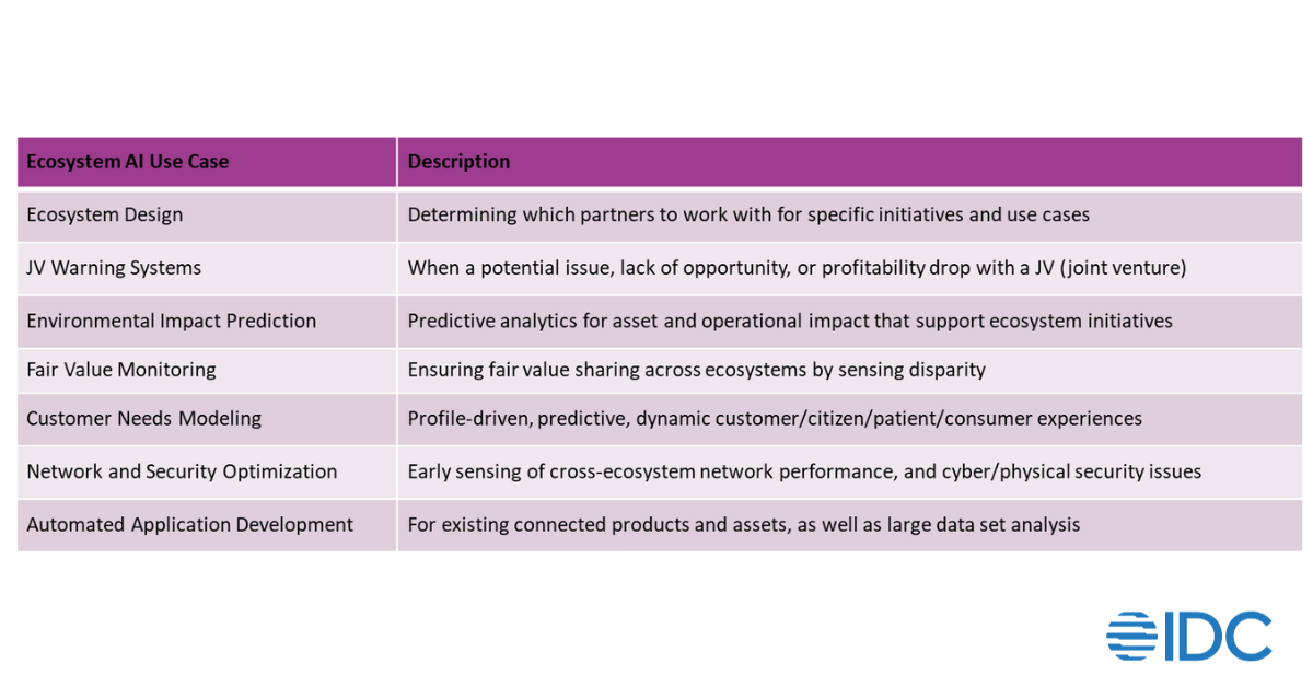 AI use cases for Industry Ecosystems will continue to develop, as ecosystem data models become larger and more diverse, and initiatives increase in complexity and scale. As enterprises are seeing the benefits of augmenting processes, collaboration, and innovation with AI and generative AI, so will ecosystems. This is one of the reasons why, according to the IDC ICT (Information & Communications Technology) Spending Guide (July 2023), that AI Platforms have seen 37% growth over the past year, far surpassing the average ICT spending of 4%.