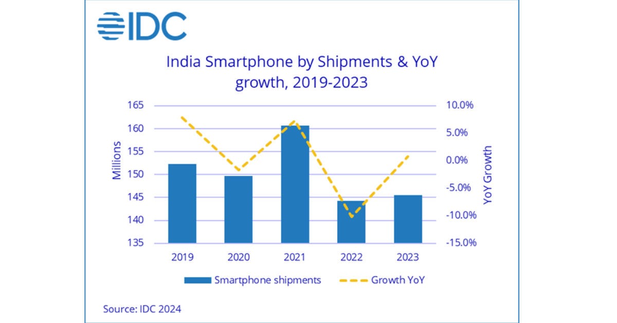 India’s smartphone market grew modestly in 2021, coming out of a challenging 2020 (due to pandemic-led shutdowns). This growth was driven by the need of a better device for remote learning/work and increasing media consumption on the go. However, in 2022 and 2023 the market faced challenges because of the rising average selling price (ASP) for devices (growing by a CAGR of 38% from 2020 till 2023), improving device quality, and continuing income stress especially in the mass consumer segment. This in turn has elongated the average smartphone replacement cycle in India from 24 months to almost 36 months currently, further restricting the growth of the new smartphone market.