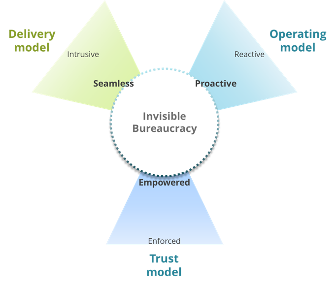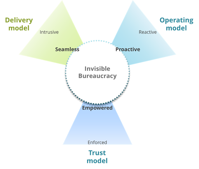 - Trust model. The next generation of invisible bureaucracy will shift from enforcement to empowerment. Instead of enforcing compliance after the fact, the government will make compliance easy for constituents through automated, proactive services, and simplified regulations. Government will invest in digital trust through proactive, transparent personalized notifications, and tools to see how personal data is being used across departments.
