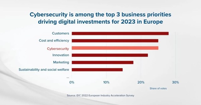 The results of IDC’s European Industry Acceleration Survey 2022 align with this trend: 32% of respondents regard cyberthreats as an external factor that negatively impacts the organization. It is thus not surprising that 34% of respondents expect cybersecurity regulations to have a major impact on business in the next two years. In 2023, cybersecurity will continue to be among the top priorities driving digital investment.