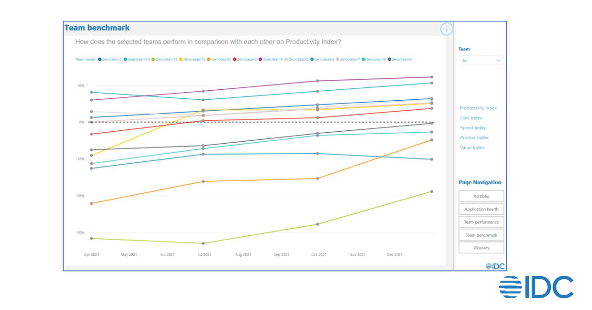 These insights are the starting point for actual management based on facts. Start with questions like: why is one team performing better than others? Do they use better practices, do they have a better requirements analysis process, better developers that understand the application better, fewer defects, etc.? What is the quality and risk level of the applications the teams are working on? IDC consultants help the teams improve, using best practices that have a proven positive effect on team performance.