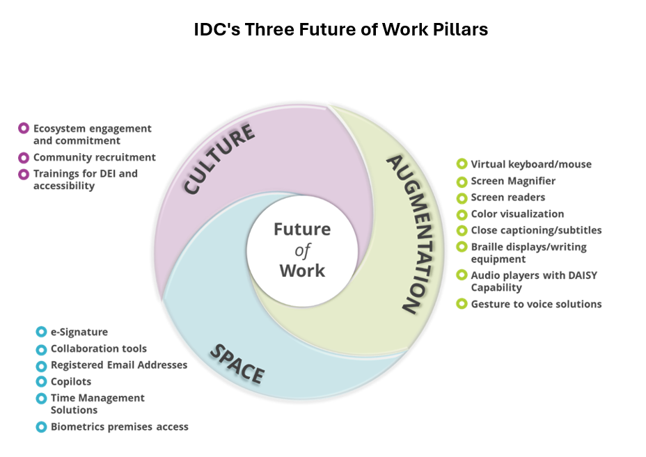 The figure below showcases technologies and initiatives that could be implemented for digital accessibility across IDC’s three main Future of Work pillars.