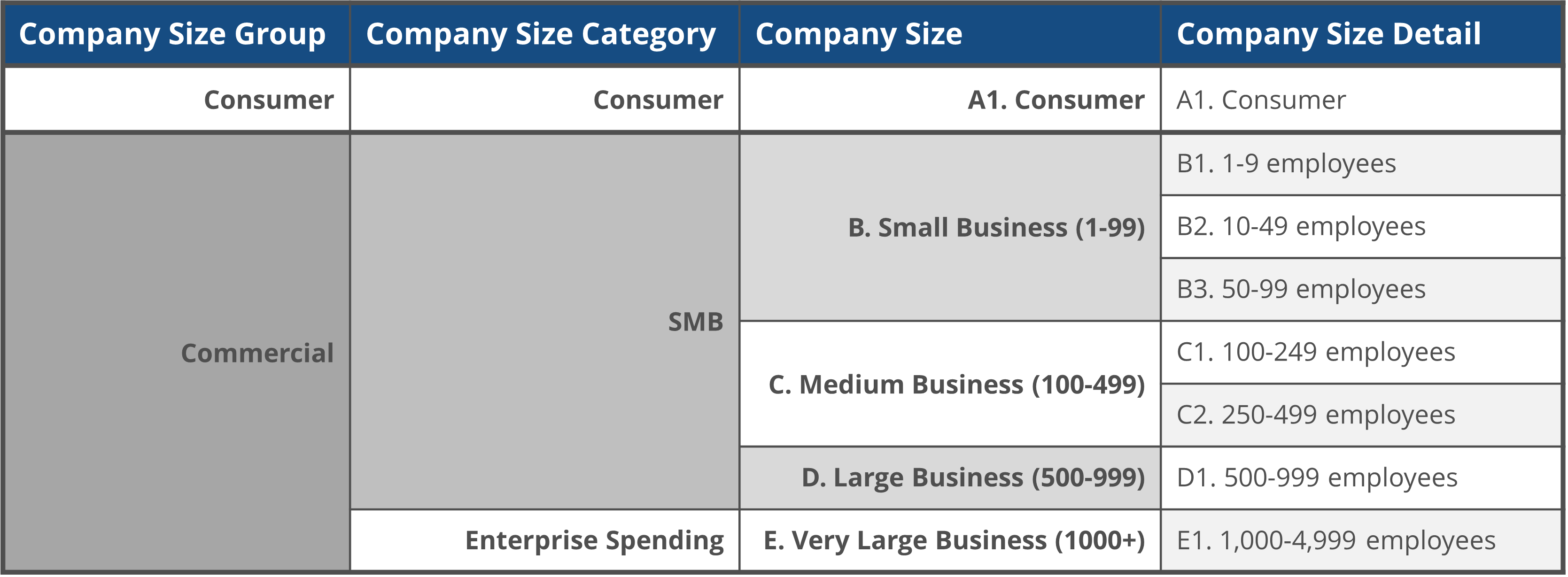 With a target release of January 2024, IDC will introduce new company size details to the Enterprise and SMB ICT Spending Guide taxonomy. The change will result in nine ranges of company size across five size segments which are further categorized and grouped. See the figure below for full details on this size segment update.