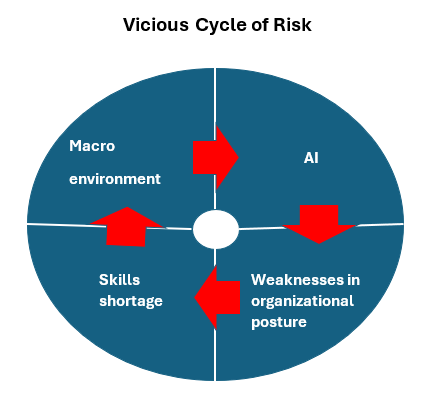 A vicious cycle of risk is at play. It involves political factors that may trigger changes in the threat landscape, advances in AI, and a shortage of resources in organizations. This is driving cybersecurity and business leaders to bring forward cybersecurity services spending.