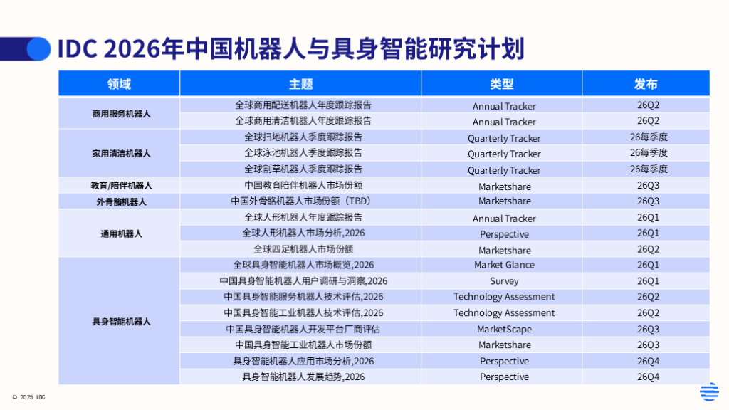 进入2026年,IDC中国机器人与具身智能研究团队持续跟进技术、市场、应用进展,如需进一步了解报告内容或机器人市场,请与IDC 中国研究经理李君兰(邮箱:lyli@idc.com)、高级分析师赵思泉(邮箱:czhao@idc.com)、研究总监潘雪菲(邮箱:span@idc.com)联系。