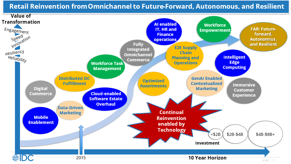 This evolution has not only reshaped retail software, hardware, and services investments but also significantly impacted the supply chain and frontline workforce. The industry is on a journey to becoming future-forward, autonomous, and resilient (FAR), leveraging AI and GenAI to take retail reinvention even farther. Let’s explore this comprehensive transformation and its implications for the future of retail. Retailers can continue to improve on omnichannel by focusing on the customer, with the most efficient product flows and engaging employee experiences in mind. The path from Omnichannel to FAR is continuous and ongoing as illustrated in the following graphic.