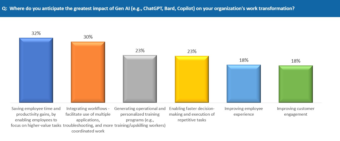 - GenAI for Employee Augmentation: For those using automation to augment workers (not replace them), generative AI assistants such as ChatGPT, Bard and Copilot paired with data analytics and Project Management tools will be key to improving employee productivity.