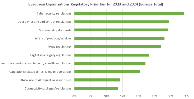 European organizations expressed their concerns and the impact the believe they will face from Regulations in the coming years of 2023 and 2024, when asked about it in the European Enterprise Acceleration Survey (n=1500). The survey was conducted in late 2022 and we found that the top three priorities for European organizations are in the domains of Cybersecurity, Data Governance and Sustainability.