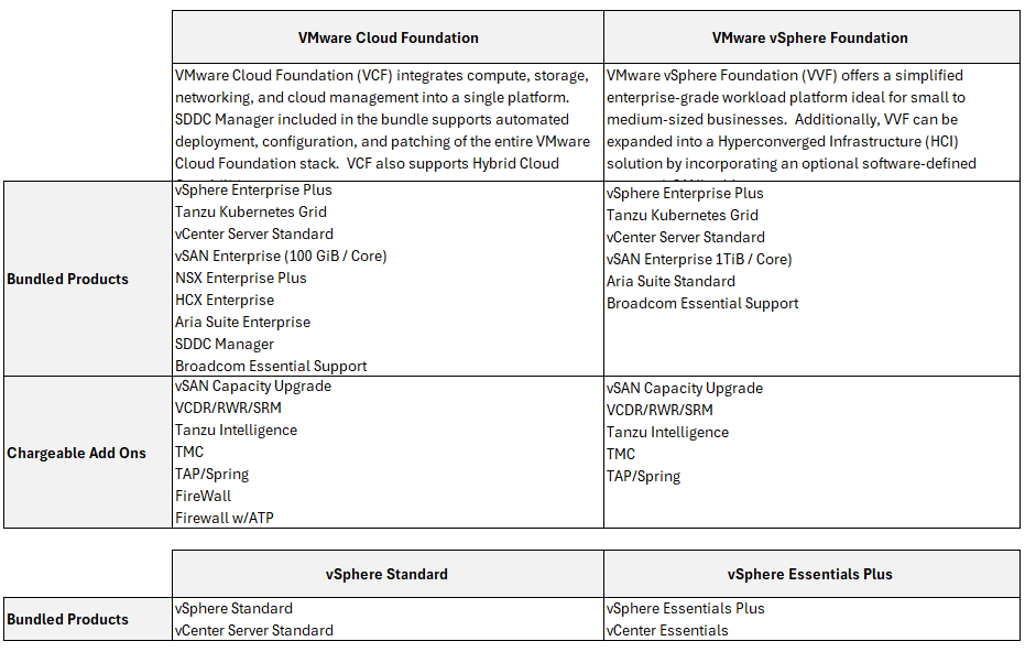 Upon completing the acquisition, VMware by Broadcom moved quickly to consolidate and “simplify” their product offerings, effectively bundling many popular products into a small number of distinct combined product offerings whilst discontinuing individual sales of individual products. Below is the feature comparison of these new offerings: