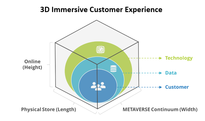 At the center of this 3D integration – between online, physical stores, and metaverse continuum – there are three core elements that are foundational of the immersive retail customer experience. The core elements are:
