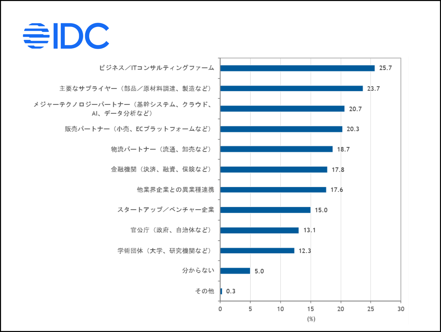 企業における、エコシステム内での企業間のシステムおよびデータ連携の実態を明らかにする調査結果を発表しました。これによると(<参考資料>参照)、国内企業のエコシステム連携では、「ビジネス/ITコンサルティングファーム」との連携が最多となり、「メジャーテクノロジーパートナー」の回答も3位という結果になりました。これは、従来のバリューチェーン上の企業との連携によるサプライチェーンの最適化や納期短縮、業務効率化にとどまらず、エコシステム全体やその横断的な事業の変革、さらには付加価値の共創を目指す戦略的な連携を重視する企業が増えていることを示唆していると推察されます。