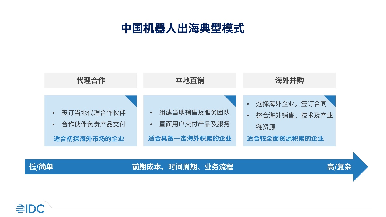 中国机器人厂商出海业务开展主要会采用代理合作、本地直销、海外并购等典型模式,这三种模式分别显示了厂商在成本投入、时间周期及业务流程等方面从低到高的投入。