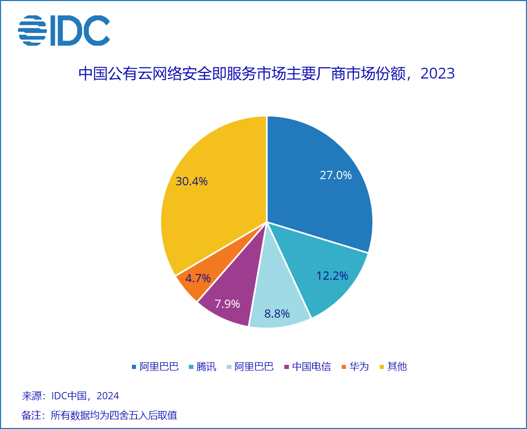 IDC数据显示,2023年中国公有云网络安全即服务市场规模为79.3亿元人民币,相较于2022年实现了12.6%的同比增长。从市场份额来看,阿里巴巴、腾讯、中国电信、华为、中国移动等组成了该市场的主要玩家。具体内容详见下图: