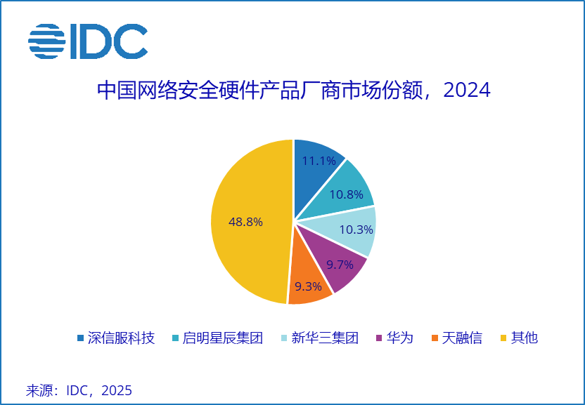 在此背景下,IDC于2025年4月正式发布《中国网络安全硬件市场份额, 2024 :生成式 AI 或将成为未来网络安全硬件市场增长的重要推动力》研究报告( Doc#CHC53286424 , 2024 年 4 月) ,该报告针对2024年中国整体网络安全硬件产品市场的规模、增长速度、主要玩家、市场与技术的发展趋势等内容进行了详细研究。其中,报告数据显示,2024年,深信服科技、启明星辰集团、新华三集团、华为和天融信以其产品技术和市场销售等多方面优势在激烈的市场竞争中占据了主导地位,2024年中国网络安全硬件产品具体的市场份额详见下图: