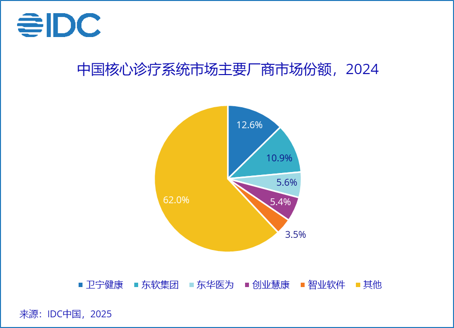 北京,2025年7月2日——国际数据公司(IDC)于近日发布了《中国医疗核心系统市场份份额,2024:新一轮验证》(Doc#CHC53534325, 2025年6月) 报告。报告列出了中国医院核心诊疗系统主要厂商的市场份额,分析了医院核心诊疗系统市场的发展趋势和竞争态势,并对领先厂商在2024 年的市场表现进行了分析评价。本报告可供医院在选择医院核心系统供应商时参考,也可供投资机构参考,以及综合性IT厂商在选择合作伙伴时做参考。