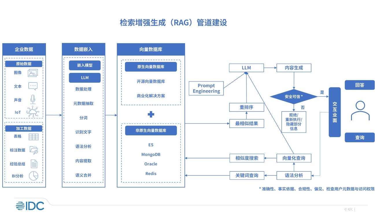 北京,2024年11月01日——当前,RAG与向量数据库是AI厂商布局的重点方向之一。2023年全球非结构化数据占比达到92.9%,用户需要更好地管理、治理这些数据从而用于更精准的分析和AI内容生成。IDC于近日发布了《 RAG 与向量数据库市场前景预测》( Doc# CHC52204725 , 2024 年 10 月), 报告绘制了RAG管道建设路径以及其中包含的主要技术和算法,收录并评估了市场中的主要厂商,来为市场选型提供参考建议。