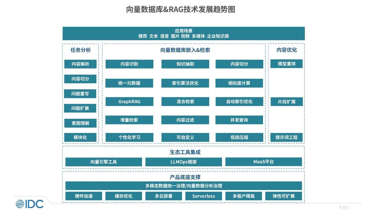 根据市场调研和访谈,IDC绘制向量数据库&RAG技术发展趋势图,梳理当前和未来技术供应商布局和企业关注重点,以为市场提供参考。