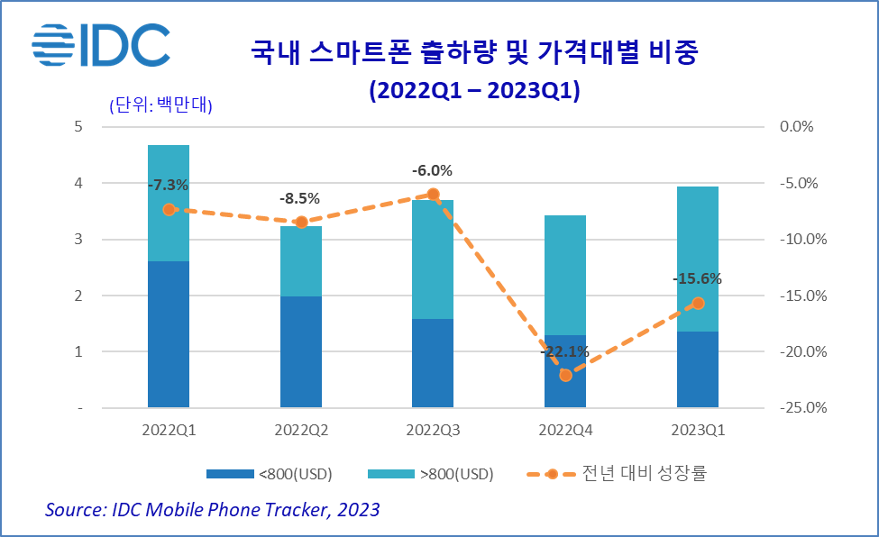 한국 IDC, 2023년 1분기 국내 스마트폰 시장 394만대 출하, 전년 대비 15.6% 감소