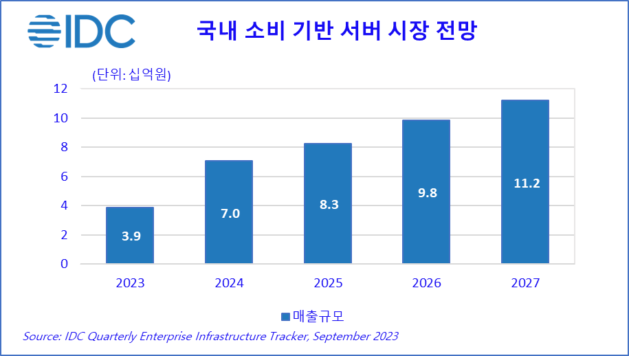 2023년 11월 23일, 서울 – IT 시장분석 및 컨설팅 기관인 인터내셔날데이터코퍼레이션코리아 (International Data Corporation Korea Ltd., 이하 한국IDC, 대표 한은선, https://qa.idc.com/kr)는 최근 발간한 ‘국내 소비 기반 서버 시장 전망 보고서, 2023-2027’에서 해당 시장이 향후 5년간 연평균 23.5% 성장률을 기록하며, 2027년 112억원의 매출 규모를 형성할 전망이라고 금일 발표했다. 국내 소비 기반 서버 시장은 많은 조직이 기존 온프레미스 시스템을 퍼블릭 클라우드 서비스로 전환하는 추세속에서 온프레미스 환경을 유지하는 동시에 기업의 유연성 및 확장성 증대 뿐만 아니라 TCO(Total Cost of Ownership) 절감 효과 기대감에 향후 성장할 것으로 분석됐다.
