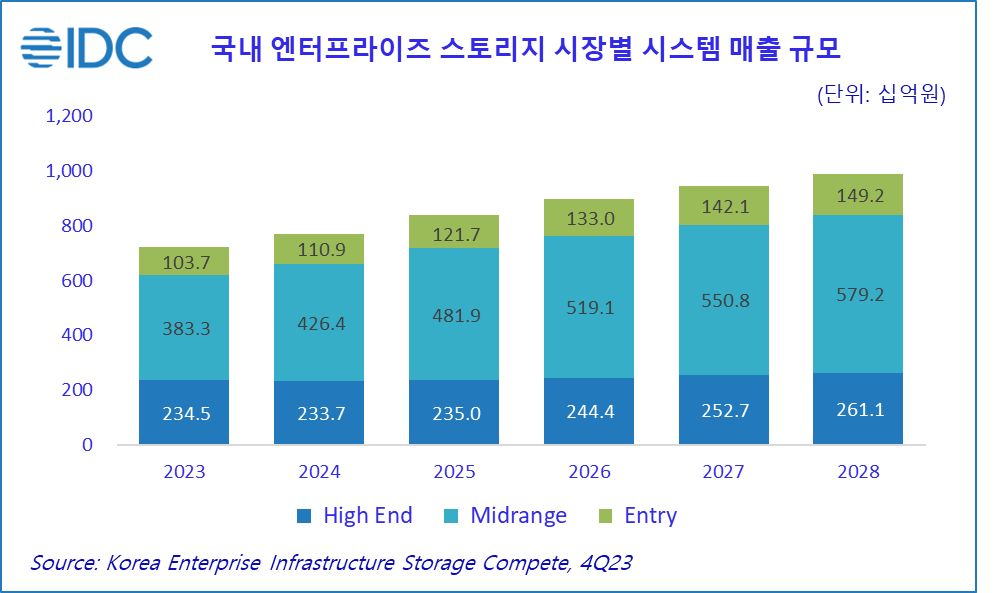 2024년 5월 28일, 서울 – IT 시장분석 및 컨설팅 기관인 인터내셔날데이터코퍼레이션코리아 (International Data Corporation Korea Ltd., 이하 한국IDC, https://qa.idc.com/kr)는 최근 발간한 ‘국내 엔터프라이즈 인프라스트럭처 스토리지 컴핏 보고서 ‘에서 국내 스토리지 시장이 향후 5년간 연평균 성장률(CAGR) 6.5%를 기록하며 2028년 9,894억원의 매출 규모를 형성할 전망이라고 금일 밝혔다. 국내 스토리지 시장은 NVIDIA GPU 환경을 지원하는 AI 및 생성형 AI 워크로드의 가파른 증가로 대용량 데이터의 경제적인 대응이 가능해지며 시장 성장을 견인할 것으로 분석됐다.