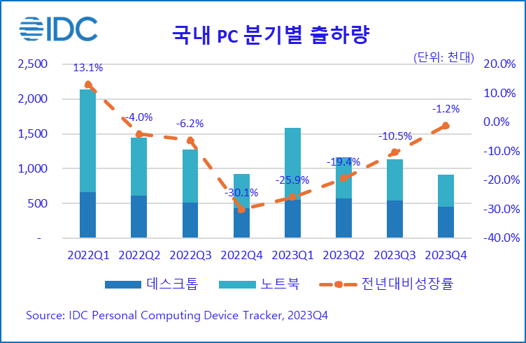 2024년 2월 16일, 서울 – IT 시장분석 및 컨설팅 기관인 인터내셔날데이터코퍼레이션코리아 (International Data Corporation Korea Ltd., 이하 한국IDC, 대표 한은선, https://qa.idc.com/kr)는 최근 발표한 국내 PC 시장 연구 분석에서 2023년 국내 PC 시장은 전년 대비 17.0% 감소한 480만대를 출하했다고 금일 밝혔다. 온라인 수업 및 재택 근무 수요의 약화로 국내 PC 출하량은 2022년 2분기 이후 7개 분기 연속 감소하였지만, 탄력적인 채널 재고 운영과 디지털 교육 전환을 위한 노트북 보급, 노후화된 사무실 데스크톱 교체에 힘입어 낙폭은 점차 줄어드는 추세다. 2023년 4분기 기준 전세계 및 국내 시장은 전년 대비 각각 -1.8%, -1.2% 감소하여 시장 회복에 대한 기대감이 높아지고 있으며, 온디바이스 AI에 대한 사용자 관심은 PC 시장에도 긍정적인 모멘텀으로 작용할 전망이다.