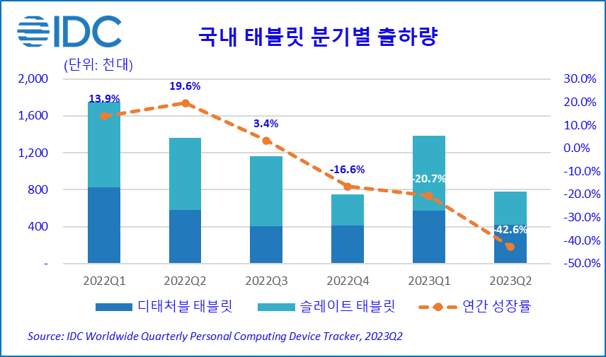 한국IDC, 2023년 2분기 국내 태블릿 시장 77만대 출하, 전년 대비 42.6% 감소