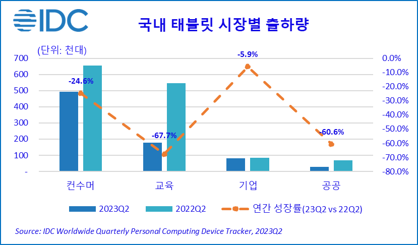 2023년 10월 10일, 한국 – IT 시장분석 및 컨설팅 기관인 인터내셔날데이터코퍼레이션코리아 (International Data Corporation Korea Ltd., 이하 한국IDC, 대표 한은선, https://qa.idc.com/kr)는 최근 발표한 국내 태블릿 시장 연구 분석에서 2023년 2분기 국내 태블릿 시장은 77만대를 출하하며 전년 동기 대비 42.6% 감소했다고 금일 밝혔다. 같은 기간 전 세계 태블릿 시장이 30.2% 감소한 것과 대비하여 큰 낙폭을 보였다. 지난해 국내 태블릿 시장은 공교육 스마트 기기 보급 사업을 특수로 사상 최대 실적을 기록하였으나 해당 사업의 규모가 축소되며 4분기부터 역성장 전환 후 3개 분기 연속 하락세를 기록한 것으로 나타났다.