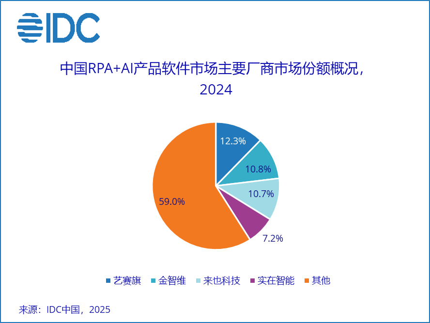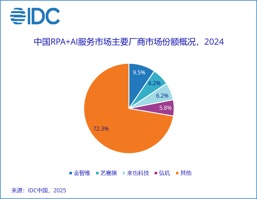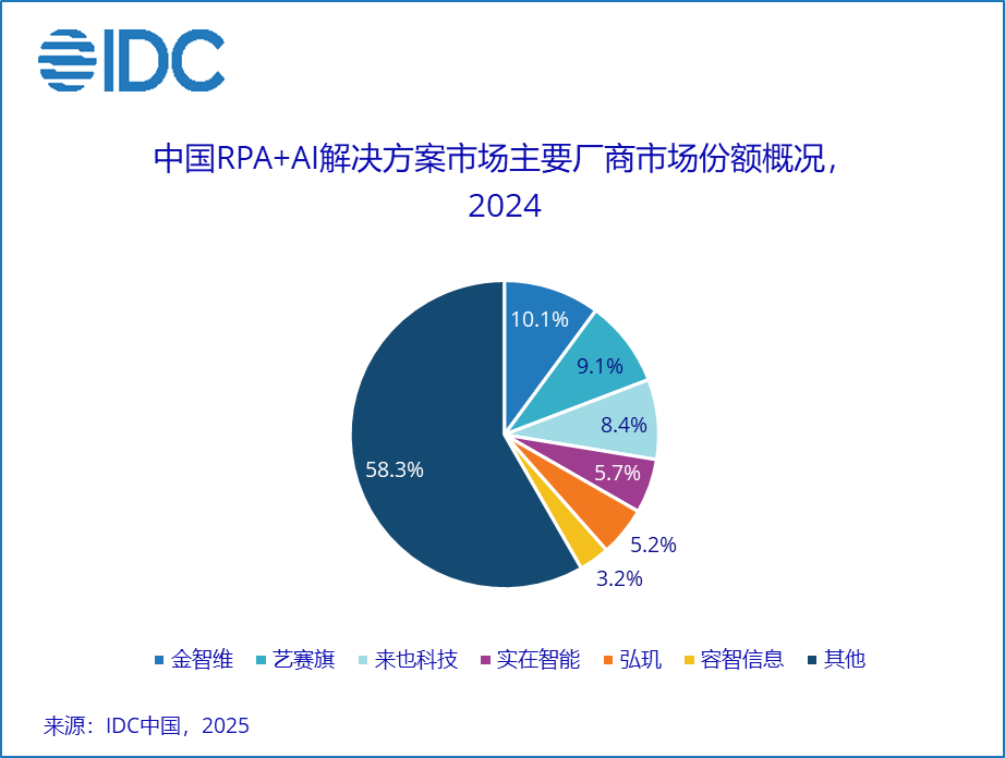 IDC数据显示,2024年中国RPA+AI解决方案市场规模达31.5亿元,同比增长27.4%。金智维(10.1%)、艺赛旗(9.1%)、来也科技(8.4%)稳居前三,实在智能、弘玑、容智信息等厂商紧随其后,前六家厂商共同占据41.7%份额。AI Agent的商业化落地打破原有竞争格局,中小厂商通过差异化方案抢占细分场景,推动市场份额多元化。整体来看,RPA作为AI Agent刚需工具推动市场增速反弹超10%,服务型商业模式因更贴近中国企业降本增效需求,正加速重构市场结构。