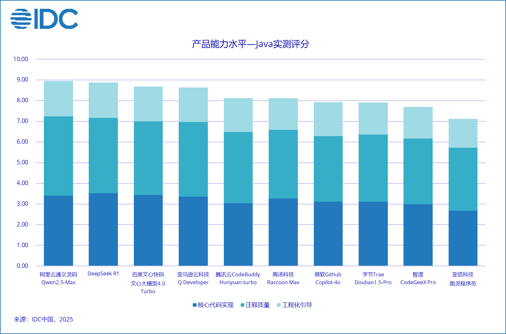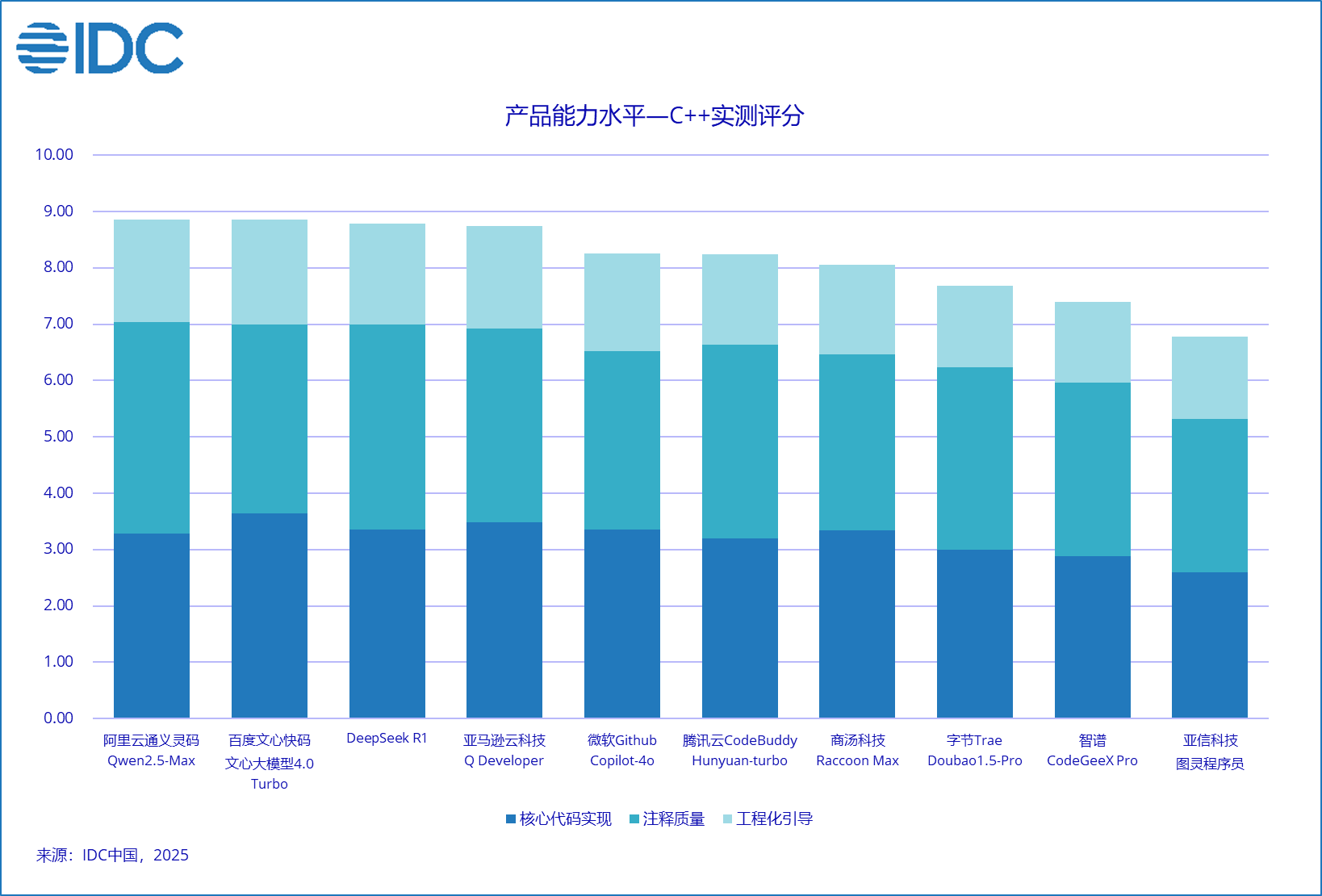 北京,2025年6月3日——国际数据公司(IDC)于近日发布了《中国市场代码生成产品评估, 1H2 5 》( Doc# CHC 52928825 , 202 5 年 5 月 ) ,报告对AI Coding产品进行了市场分析和调研,并测试了中国市场的主流产品,从核心代码实现、注释质量、工程化引导三个维度进行模型打分,并对产品整体能力进行评估,来为市场用户提供选型参考。