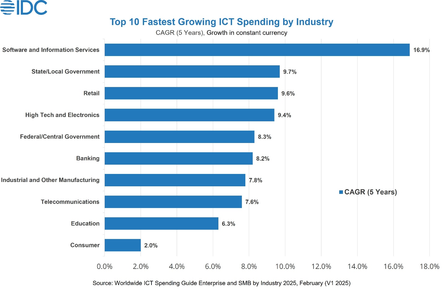 The top 10 fastest-growing industries account for almost 80% of Asia Pacific’s total ICT Spending Market. Verticals in the Asia Pacific market are embracing ICT spending by focusing on digital transformation initiatives, AI implementation, and strengthening cybersecurity infrastructure. Organizations are prioritizing technological resilience and digital capabilities despite challenges like trade restrictions, geopolitical tensions and cybersecurity threats. This strategic focus is driven by the need to enhance operational efficiency, customer experience and competitive advantage in a rapidly evolving digital landscape.