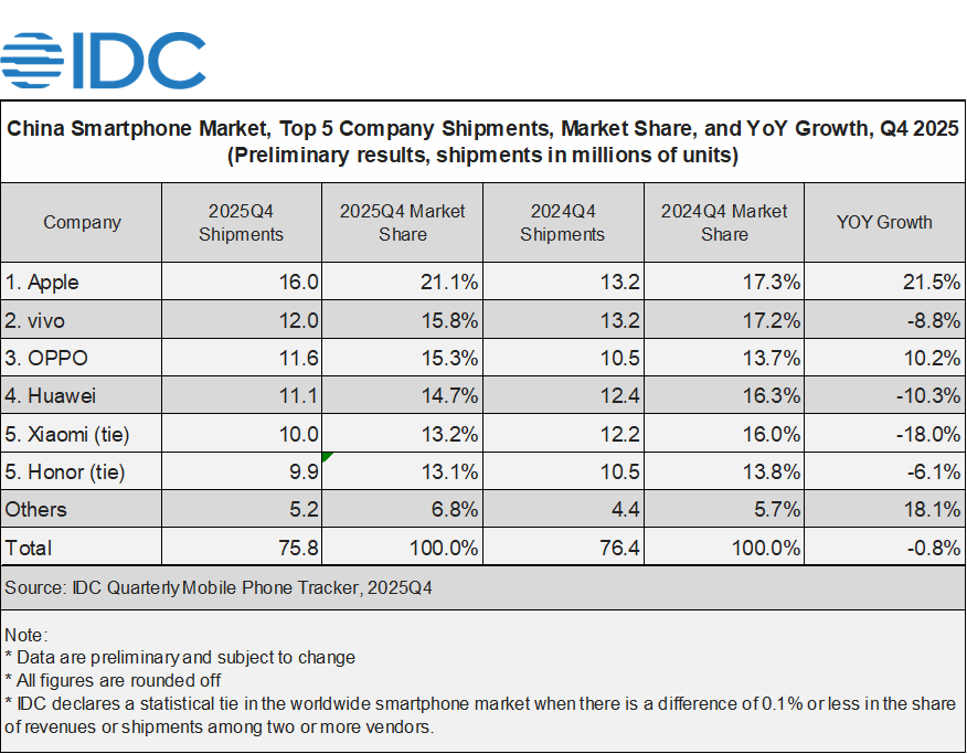 BEIJING and BOSTON, January 14, 2026 – According to preliminary data from the International Data Corporation (IDC) Worldwide Quarterly Mobile Phone Tracker, China’s smartphone market shipped 75.8 million units in 4Q25, a slight 0.8% year-on-year (YoY) decline. Under the pressure of rising memory costs, the majority of domestic brands reduced low-end models’ shipments to protect profitability. Furthermore, as the stimulating effect of the government subsidy policies was limited, OEMs did not build up significant stock even with a new round of subsidies.