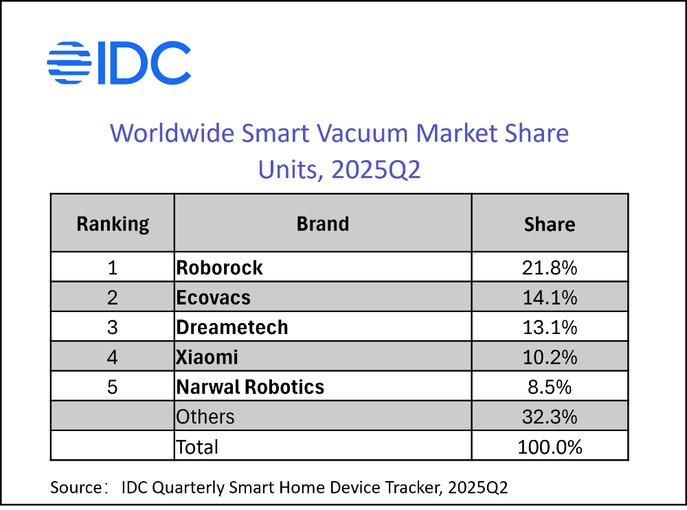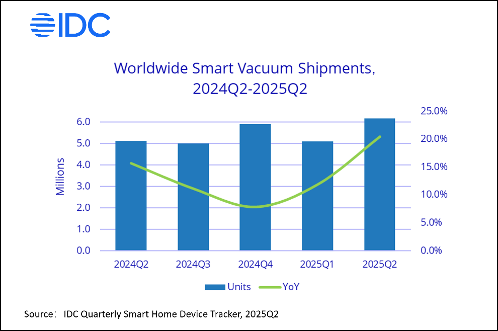 NEEDHAM, Mass., September 3, 2025 — The global smart vacuum market recorded shipments of 6.17 million units in the second quarter of 2025, reflecting a 20.5% year-over-year increase, according to the latest data from the International Data Corporation (IDC) Worldwide Quarterly Smart Home Device Tracker.