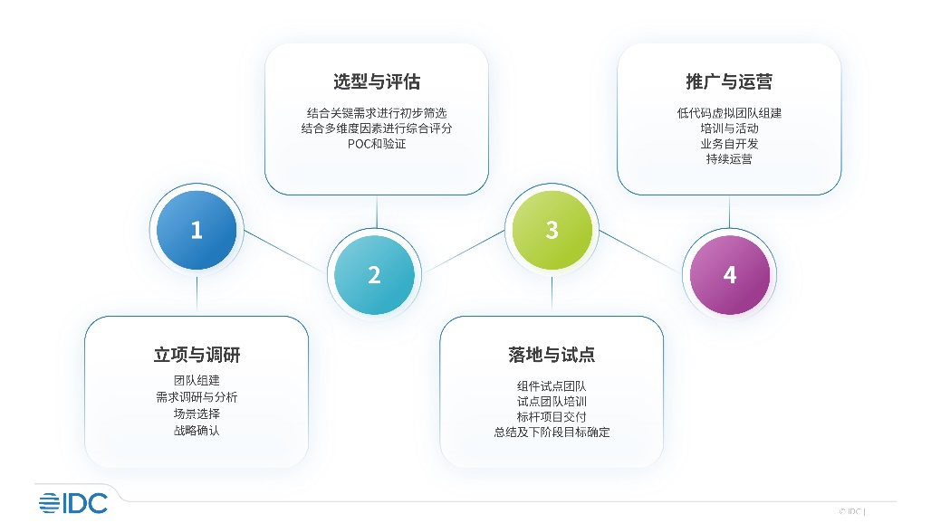 低代码转型是一个复杂的过程,不同的企业数字化转型战略不同、IT能力不同、建设驱动力不同、建设目标不同,都将导致低代码转型的路径、阶段划分、最终成果发生变化。在本项研究中,IDC结合企业低代码开发体系构建的共性过程,总结不同阶段的关键工作、工作要点、重点工作成果供企业参考。