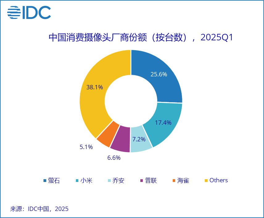 在全球消费摄像头市场格局中,萤石持续领跑行业阵营,2025 年第一季度以 420.3 万台的出货量稳居全球榜首,其中中国市场贡献了其 73.7% 的出货份额。亚马逊以 11.6% 的市场占有率紧随其后,通过与 Alexa 语音助手的深度技术融合,构建起智能化交互生态壁垒。小米则凭借新品强化其智能家居安防生态,一季度依托国内政策补贴与精准营销攻势,中国市场出货量同比激增 38.6%,增速表现尤为亮眼。乐橙在海外市场展现出显著突破,一季度海外出货量占比达 77.1%,其中亚太地区作为核心战略阵地,持续巩固其区域市场优势。普联在技术与市场双维度同步发力:一方面升级安防场景应用技术,另一方面针对不同地区市场推行差异化产品策略,通过本土化生产布局持续深化全球化市场渗透,品牌竞争力在多区域市场实现稳步提升。