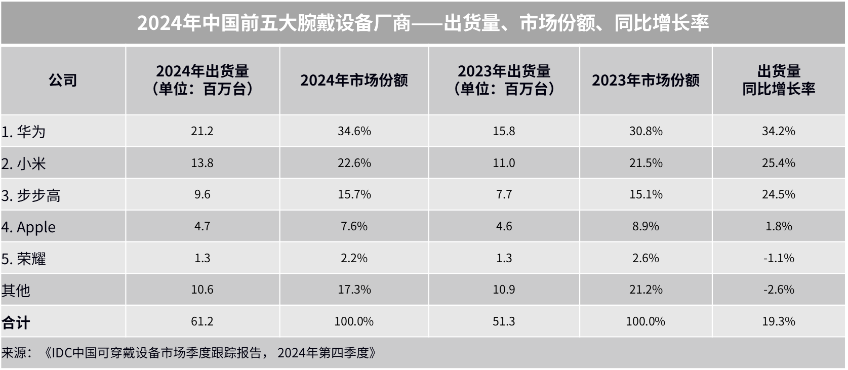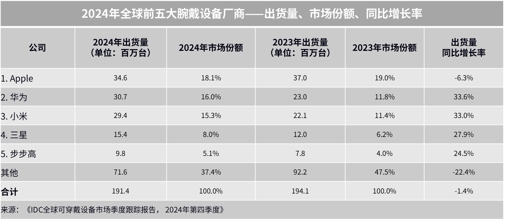 2024年三星的增长主要来自于手环产品线的贡献,尤其在发展中地区在入门级手环和入门级手表市场之间找到了更加精细的市场定位。而其智能手表业务在全球范围仍然受到来自其他头部厂商严峻的竞争压力。