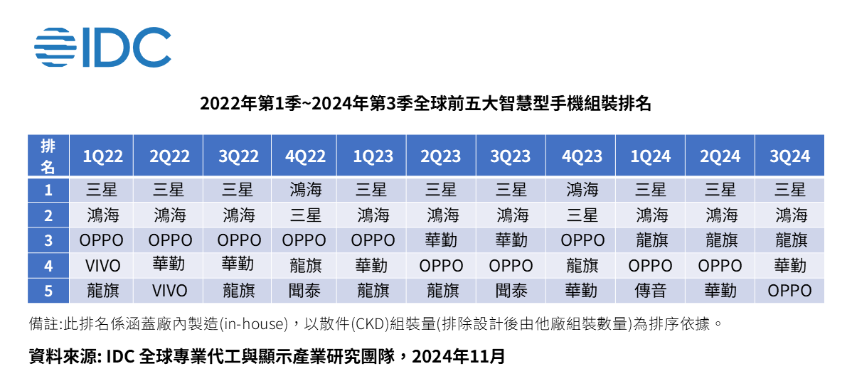 台北,2024年12月2日 ─ 根據IDC(國際數據資訊) 最新「全球智慧 型 手機供應鏈追蹤報告 (Worldwide Quarterly Smartphone ODM Tracker) 」研究顯示,在市場旺季新品發布、部分品牌廠商降價守護市場佔有率情況下,2024年第三季全球智慧型手機產業製造規模相對上季、去年同期分別成長9%、4.4%。