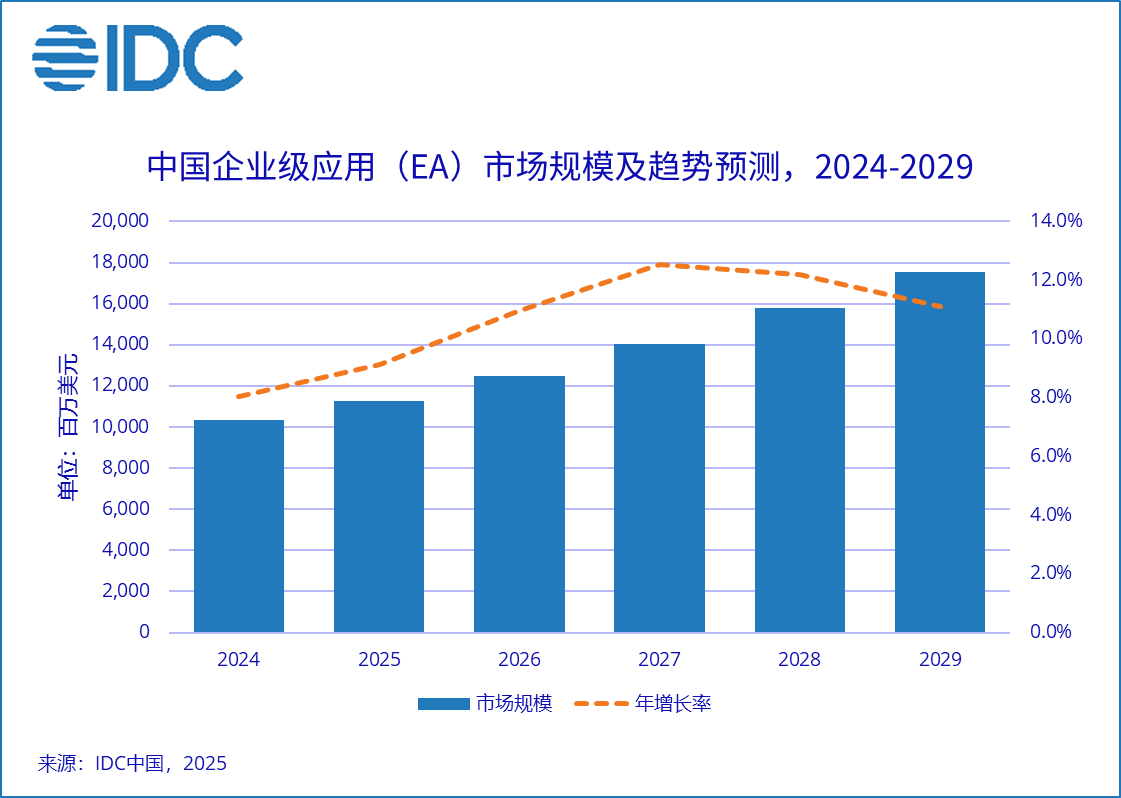 北京,2025年7月11日——国际数据公司(IDC)近日发布的《2024下半年中国企业级应用(EA)市场跟踪研究报告》中显示,2024下半年中国企业级应用管理(Enterprise Application,以下简称为EA)软件市场规模达到54.3亿美元,同比增长7.0%,虽短期受传统部署模式收缩与云转型的阵痛影响,但在国产化替代政策加速、AI大模型深度渗透等驱动下,IDC预计,2029市场规模将达到175.2亿美元,2024-2029年复合增长率(CAGR)达11.2%,进入新一轮增长周期。