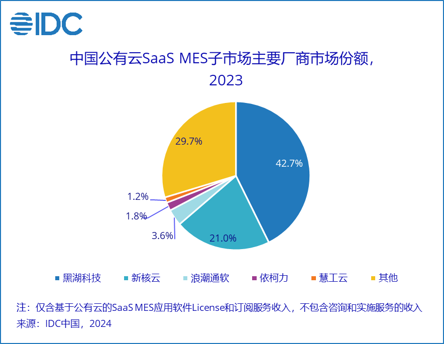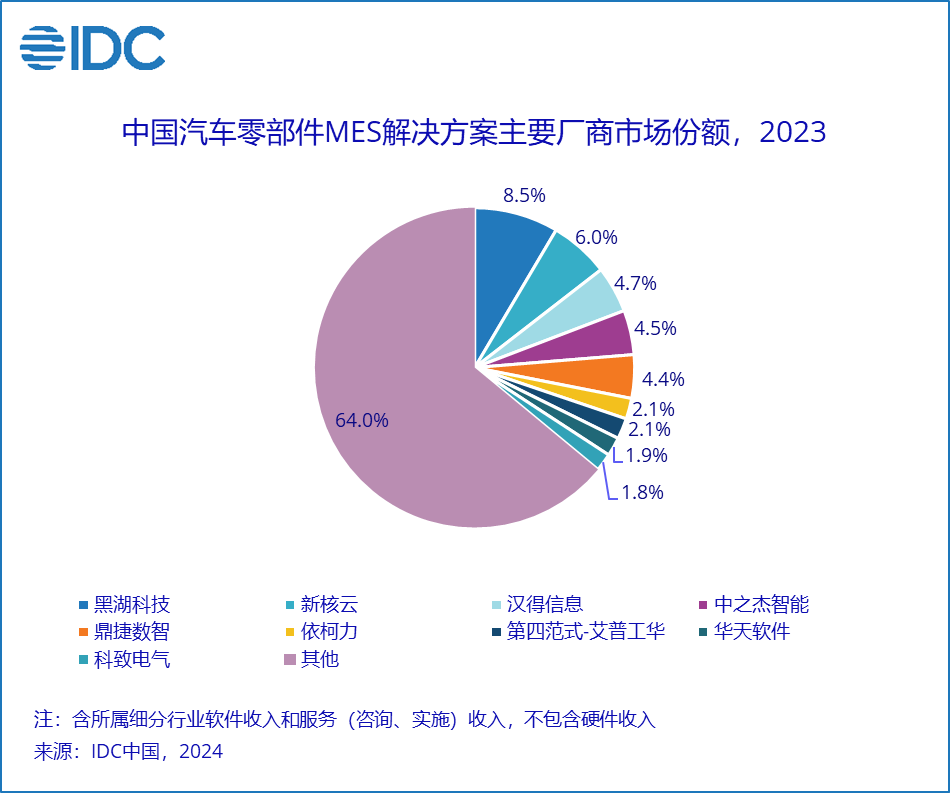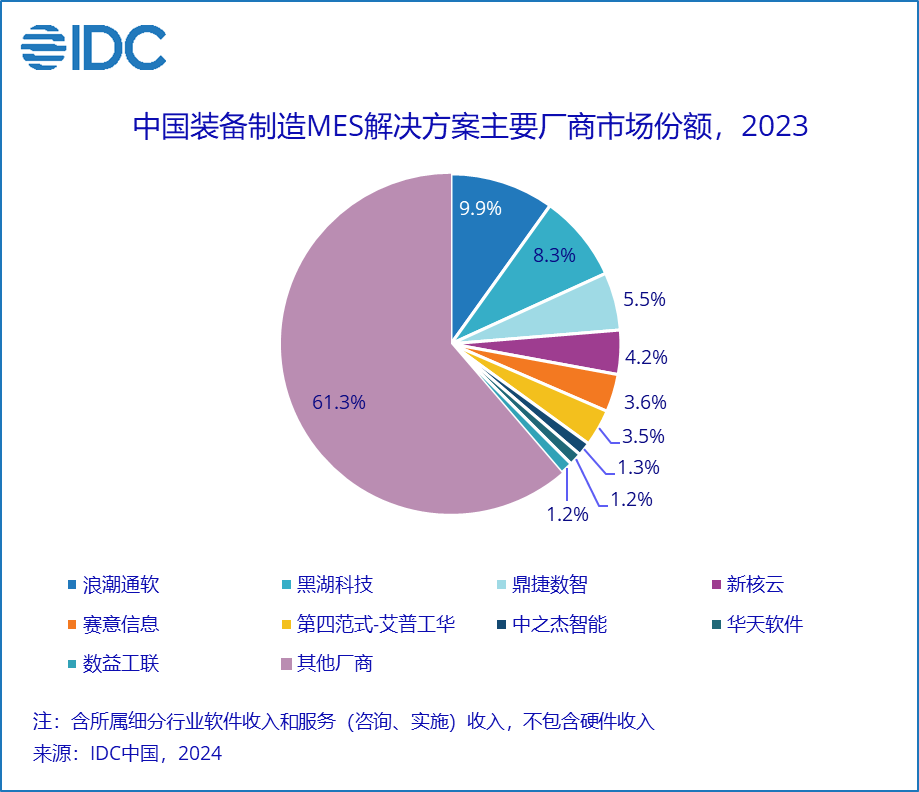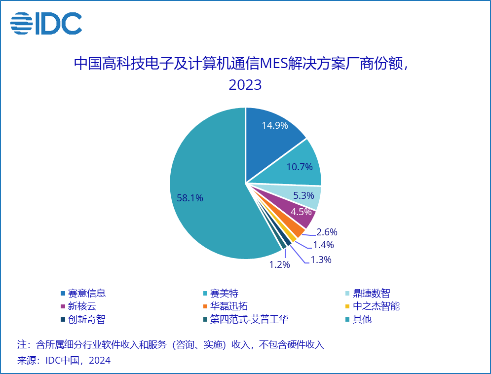 IDC数据显示,2023年中国MES解决方案总市场份额(含软件和服务,不含硬件)达到142.8亿元,年增长率为13.9%。其中,MES软件总市场份额达到54.1亿元人民币,年增长率为17.2%,增速虽稍有回落,但仍在合理区间。