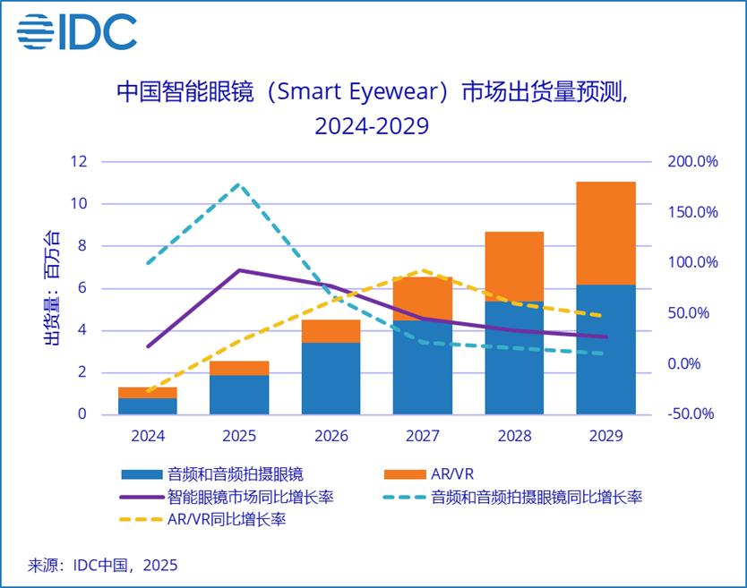 IDC预测,2026年中国智能眼镜(Smart Eyewear)市场出货量预计达到450.8万台,同比增长77.7%,其中音频和音频拍摄眼镜出货量预计343.4万台,同比增长68.1%;AR/VR设备出货量预计107.3万台,同比增长62.1%。