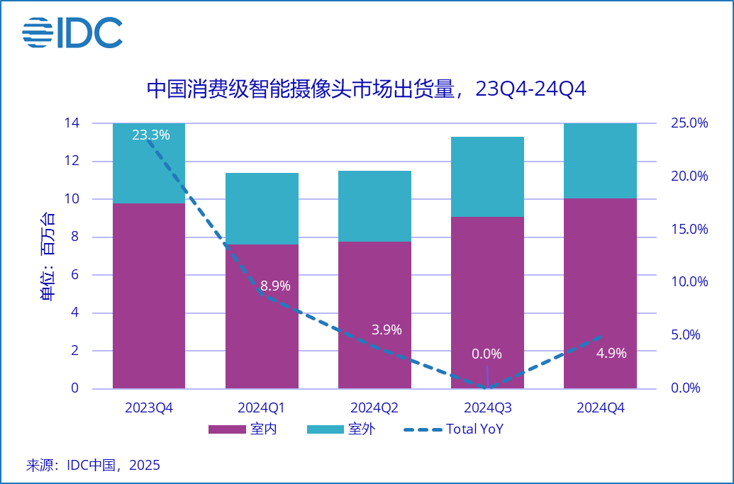 北京,2025年3月26日——IDC《全球智能家居设备市场季度跟踪报告,2024年第四季度》显示,2024年全球智能摄像头市场(包含消费级室内和室外摄像头,含运营商渠道)出货1.37亿台,同比增长7.7%,增速较2023年放缓。其中四季度全球出货3,786万台,同比增长1.8%,北美市场下滑5.4%,疫情后时代摄像头产品高速增长周期已接近尾声。