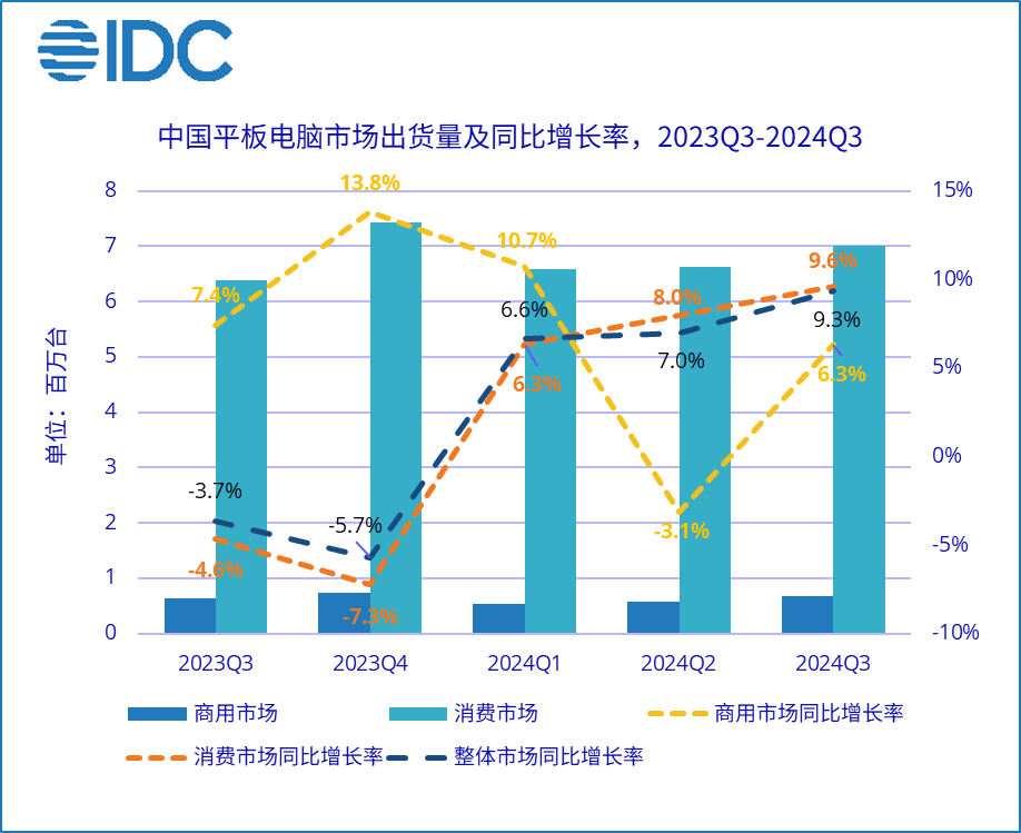 北京,2024年11月12日——近日,国际数据公司(IDC)发布了2024年第三季度中国平板电脑市场季度跟踪报告,IDC数据显示,2024年第三季度中国平板电脑市场出货量为768万台,同比增长9.3%,连续三个季度保持出货量正增长。