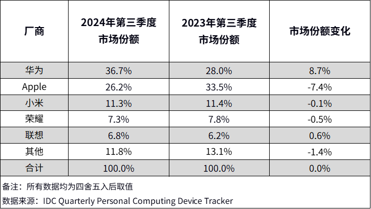 2024年第三季度中国平板电脑市场出货量排名前五厂商市场表现: