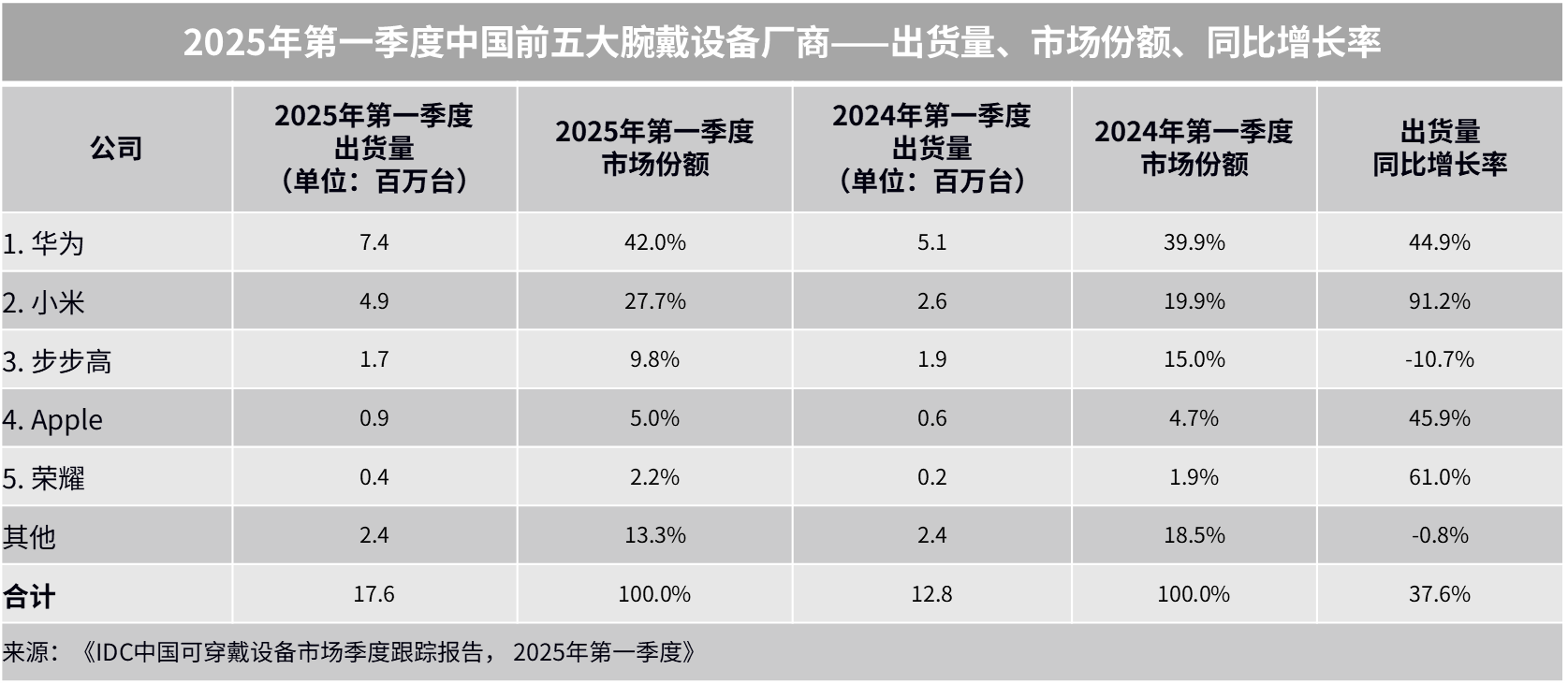 IDC:2025年一季度全球腕戴设备市场同比增长10.5%