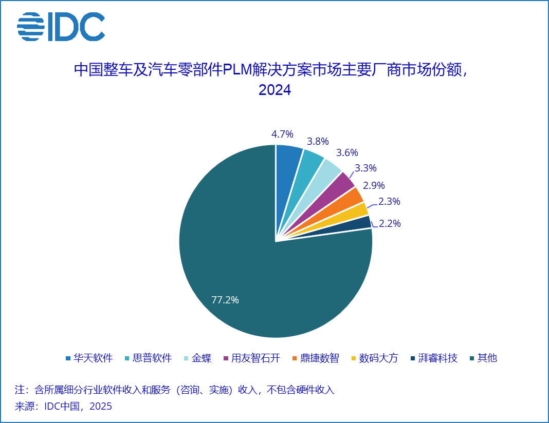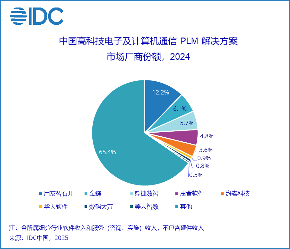 IDC 报告指出,2024年中国PLM软件总市场规模为35.1亿元人民币,年增长率为21.6%,较去年增速回升5.6个百分点。市场增速虽有所回暖,但普遍反馈市场竞争进一步加剧,客单价下降、决策周期变长现象更为普遍。从竞争格局来看,西门子、达索系统和PTC增速持续放缓,但仍然稳居市场前三名。其中,西门子市场份额从2023年的14.3%下降至11.3%,达索系统从10.2%下降至8.0%。用友智石开、金蝶、鼎捷数智、思普软件、华天软件、数码大方分列第四到第九。该市场竞争烈度在短期内并没有缓和趋势,从长期来看,随着中国制造正向研发创新的趋势进一步迈进,以及厂商格局的逐渐清晰,市场会逐渐回归理性。